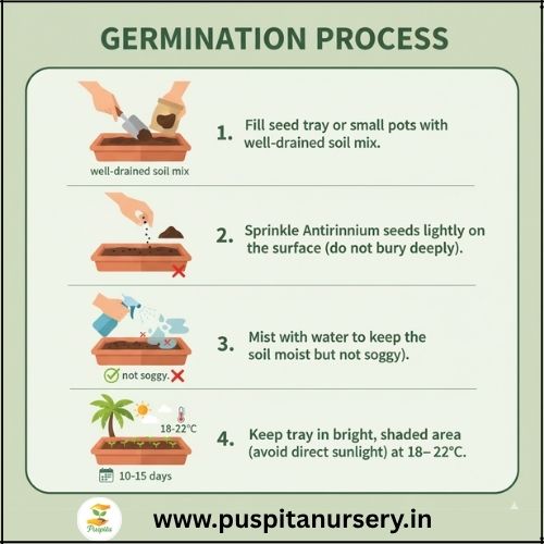 - Sprinkle Antirrhinum seeds lightly on the surface (do not bury deeply).