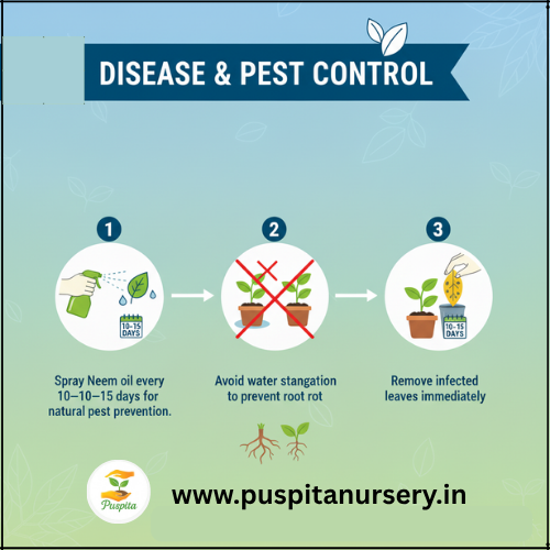 Spray Neem oil every 10–15 days for natural pest prevention.