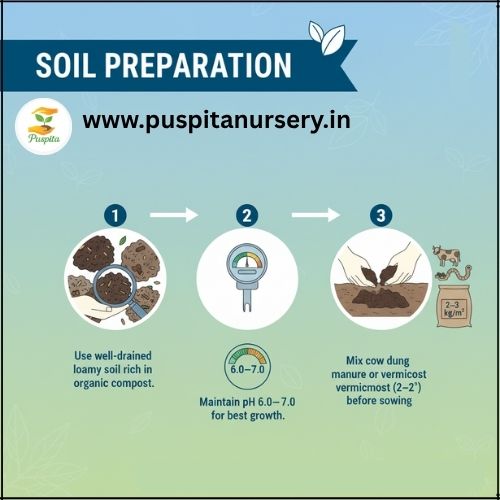 Mix cow dung manure or vermicompost (2–3 kg/m²) before sowing.
