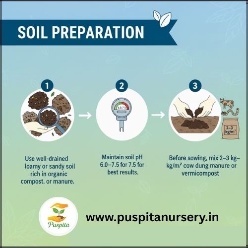 Before sowing, mix 2–3 kg/m² cow dung manure or vermicompost.