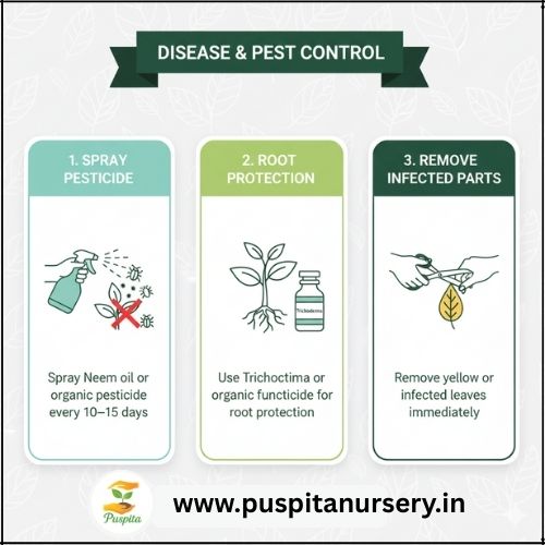 Spray Neem oil or organic pesticide every 10–15 days.