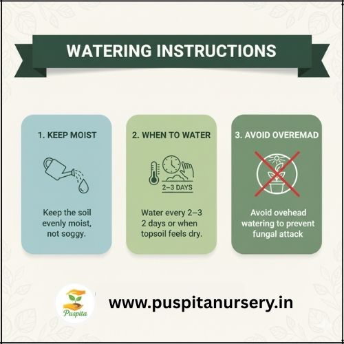 Water every 2–3 days or when topsoil feels dry.