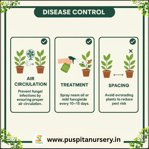 Spray neem oil or mild fungicide every 10–15 days.