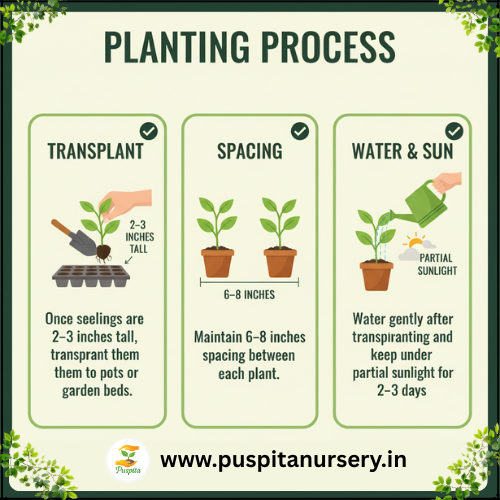 Water gently after transplanting and keep under partial sunlight for 2–3 days.