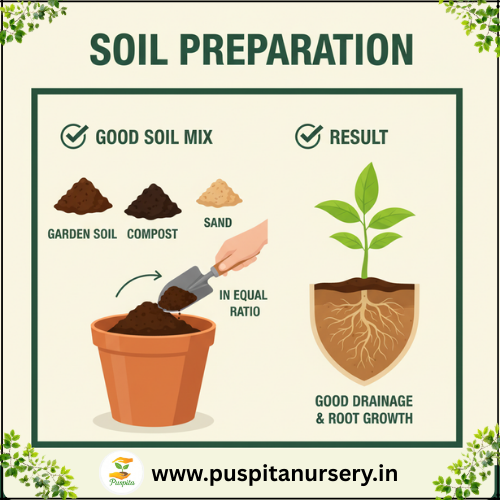 Use a mix of garden soil, compost, and sand in equal ratio for good drainage and root growth.