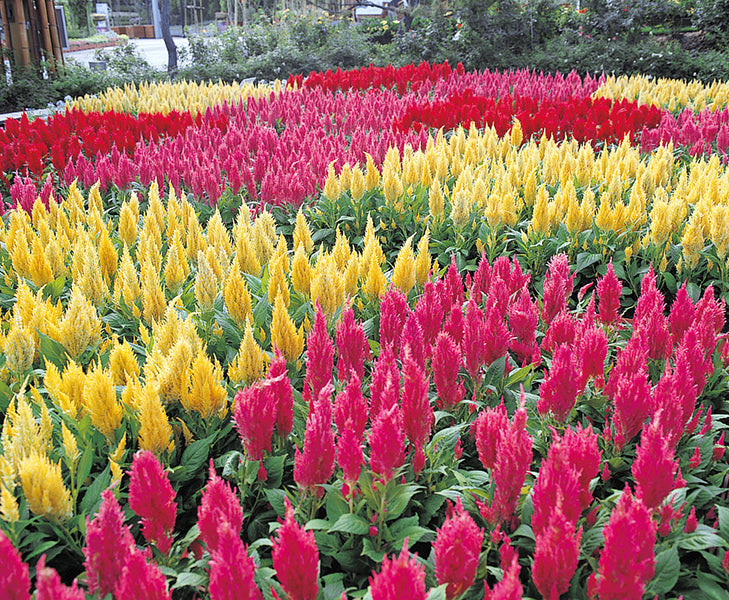 Bright & Unique Flowers – Celosia Mixed blooms with flame-shaped, feathery flowers in striking red, yellow, pink, and orange shades.