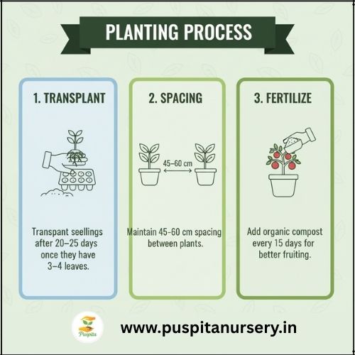 Transplant seedlings after 20–25 days once they have 3–4 leaves.