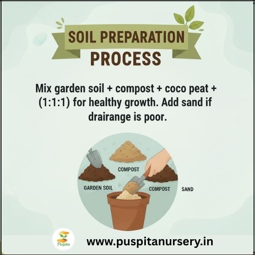 Mix garden soil + compost + coco peat (1:1:1) for healthy growth. Add sand if drainage is poor.