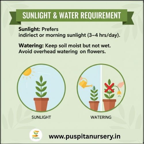 Sunlight: Prefers indirect or morning sunlight (3–4 hrs/day).