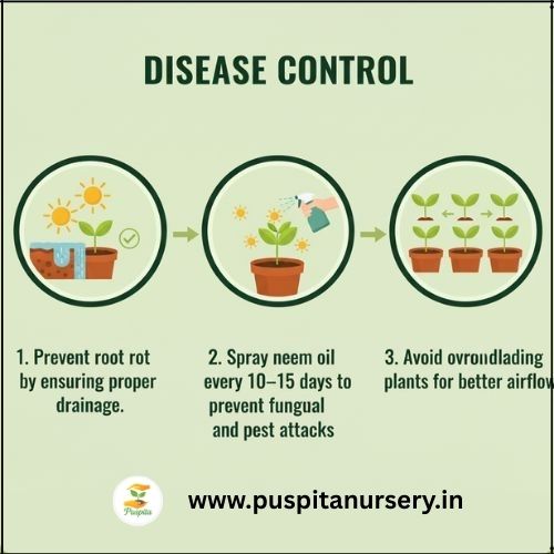 Spray neem oil every 10–15 days to prevent fungal and pest attacks.