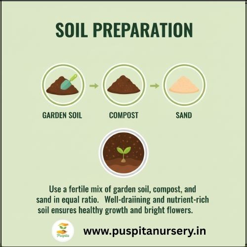 Use a fertile mix of garden soil, compost, and sand in equal ratio. Well-draining and nutrient-rich soil ensures healthy growth and bright flowers.