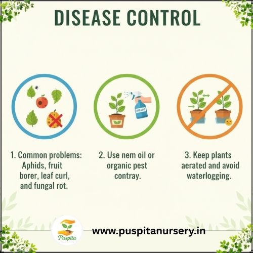 Common problems: Aphids, fruit borer, leaf curl, and fungal rot.