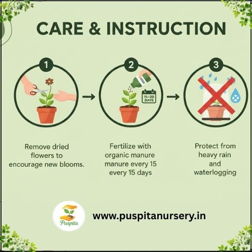Requires full sunlight (6–8 hrs/day) for best blooming.