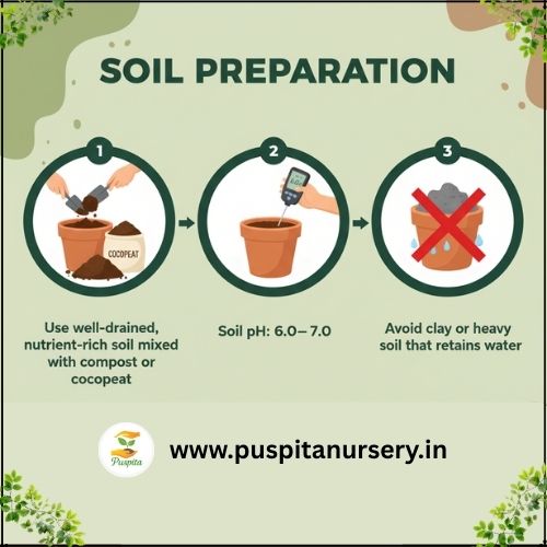 Use well-drained, nutrient-rich soil mixed with compost or cocopeat.