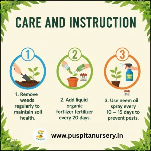 Use neem oil spray every 10–15 days to prevent pests.