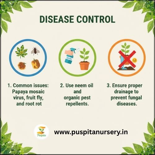 Common issues: Papaya mosaic virus, fruit fly, and root rot.