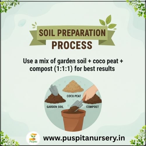 Use a mix of garden soil + coco peat + compost (1:1:1) for best results.