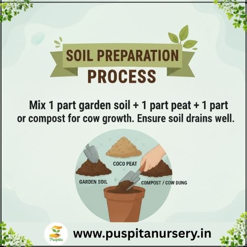 Mix 1 part garden soil + 1 part coco peat + 1 part compost or cow dung for best growth. Ensure soil drains well.