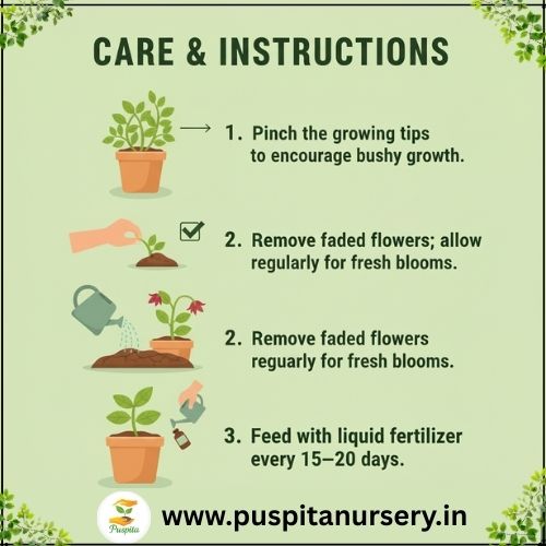 Needs full sunlight (5–6 hrs/day) for continuous flowering.