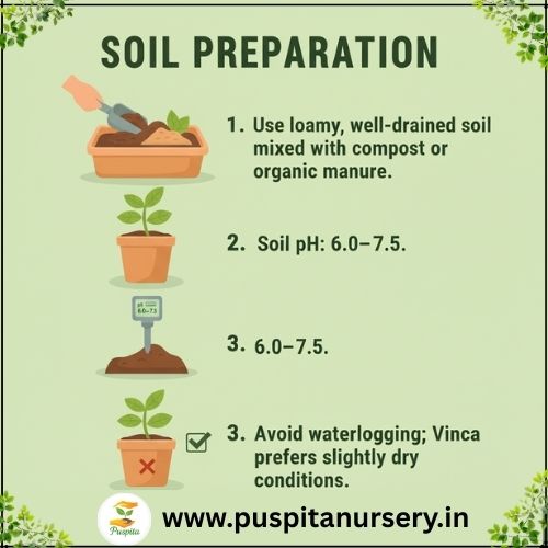 Avoid waterlogging; Vinca prefers slightly dry conditions.