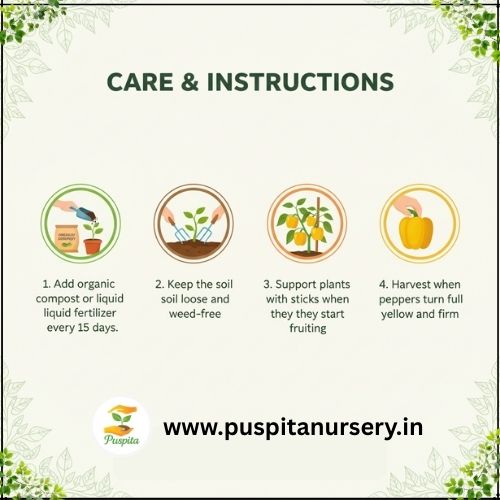 Bright Yellow Hybrid Variety: Produces large, glossy yellow bell peppers with a sweet, crunchy taste — perfect for salads, stir-fries & stuffing.