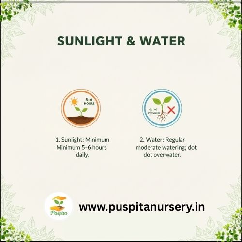 Moderate Water & Sunlight Need: Requires 5–6 hours of sunlight and moist but well-drained soil for best growth.