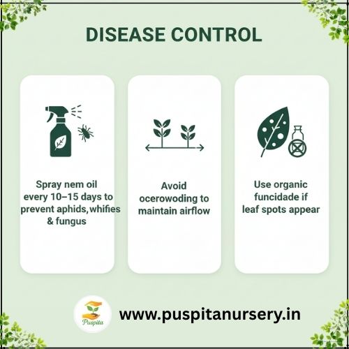 Spray neem oil every 10–15 days to prevent aphids, whiteflies & fungus.